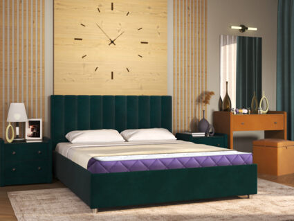 Модель отличается лаконичным изголовьем, которое украшает вертикальная параллельная стёжка. Стильная модель выделяется продуманным дизайном и украсит любой интерьер. Обивка кровати изготовлена из мягкого велюра. Короб производится из ДСП. В комплект входит ортопедическое металлическое разборное основание.