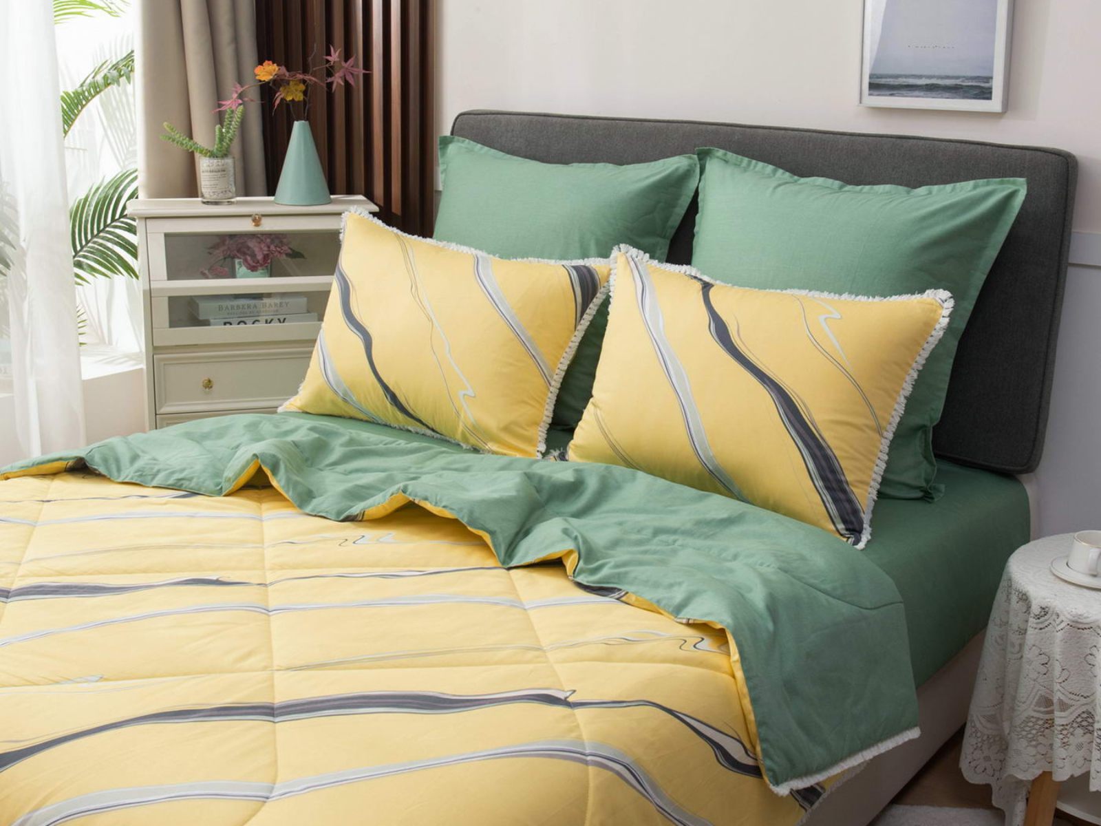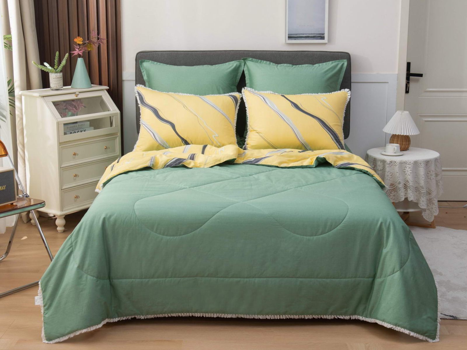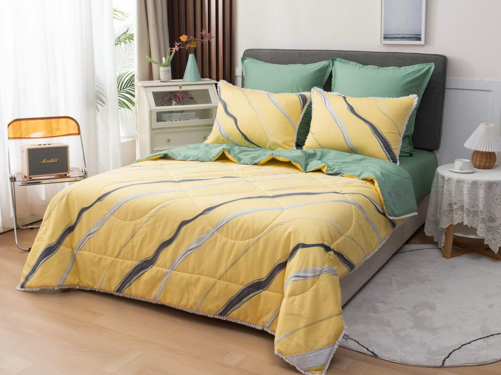 В комплекты комфортеров с одеялом Бернадетт входят наволочки, простыня и легкое всесезонное одеяло. Оцените это современное и очень удобное решение, которое идеально подходит тем, кто не любит возиться с пододеяльниками.