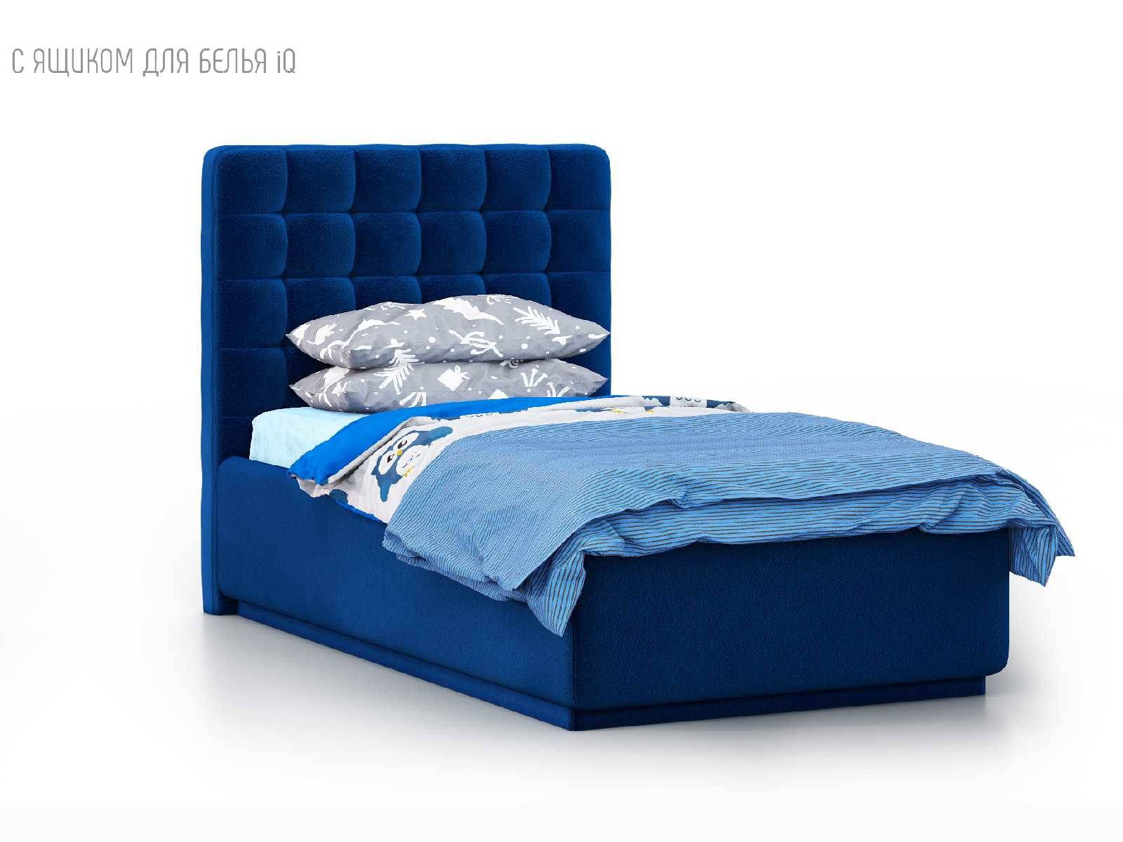 Кровать укомплектована IQ с подъемным механизмом и ящиком для белья без дна (дополнительная платная опция - дно к ящику IQ из HDF (ХДФ). Каркас кровати на цоколе, декоративный чехол на цоколе съёмный. Глубина ящика для белья - 30 см, без ограничения нагрузки на ящик.