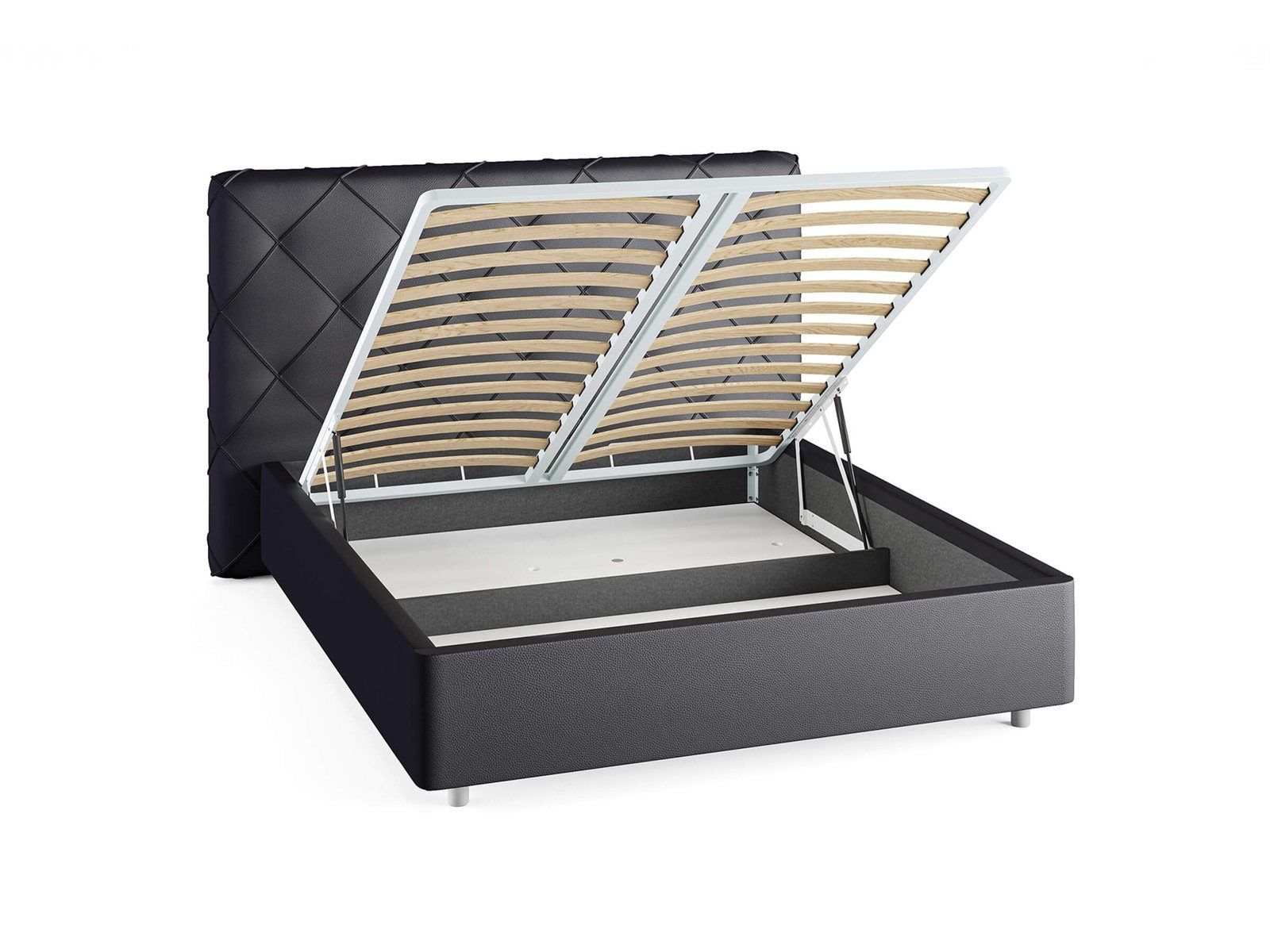 Кровать комплектуется металлическим основанием и подъемным механизмом со вместительным бельевым ящиком. Дно бельевого ящика легко сдвигается для обеспечения уборки под кроватью.