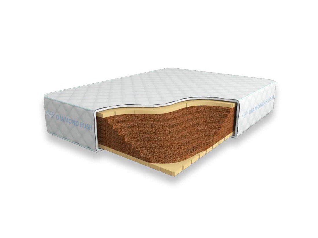 Матрас Diamond Rush Cocos Lite 27 DR является беспружинным. В основе модели идут кокосовые плиты, сверху и снизу для большего комфорта и придания средней жесткости прокладываются листы по 3см натурального перфорированного латекса.