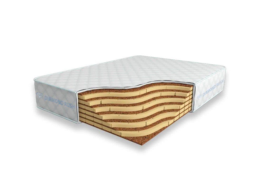 Матрас Diamond Rush Mono Mix Cocos 25 DR является беспружинным, т.е. не имеет в своей основе пружинного блока. В его состав входят одно или несколько чередований слоев латексированной кокосовой койры (1см) и натурального латекса с перфорацией (3см). Такая модель матраса относится к среднежестким и обладает ортопедическим эффектом.