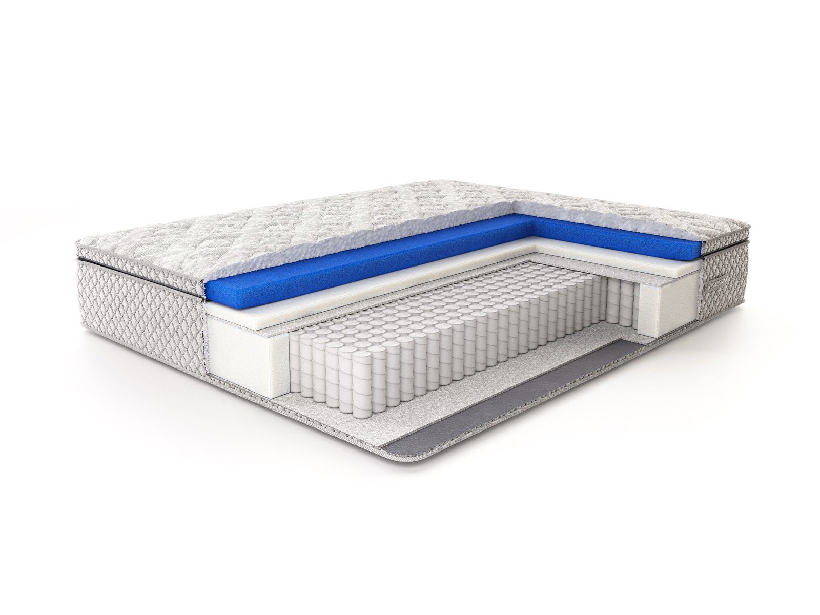 Роскошный рельефный чехол из жаккарда, простёганный по типу «слоёный пирог»: объёмное гипоаллергенное волокно холлкон 300 гр., ППУ 1 см, спанбонд — максимальный первоначальный комфорт. Чехол матраса несъемный.