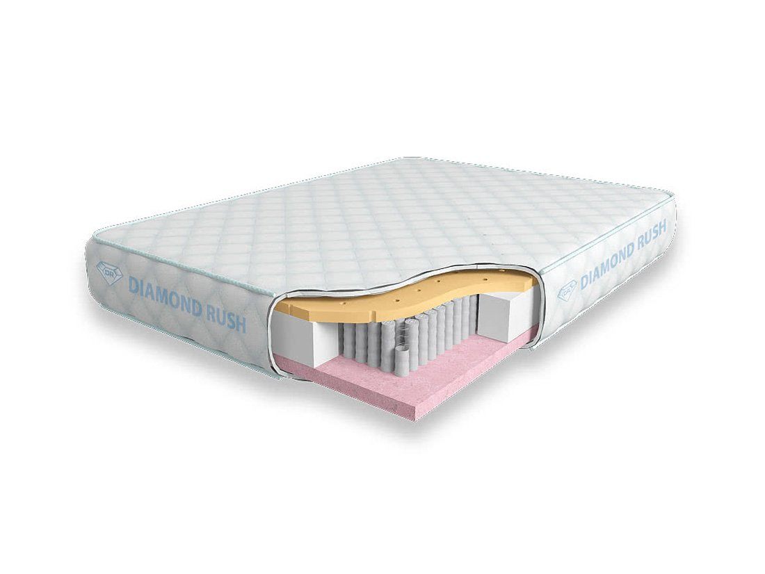 Матрас Diamond Rush Soft Great 1440DR имеет в своей основе независимый пружинный блок 1440, состоящий из пружин диаметром 3-4 см. В качестве настилочных слоев поверх пружинного блока используются листы натурального латекса с перфорацией и вязкоэластичного Меморикса, обладающего эффектом памяти. Обе стороны матраса являются мягкими.