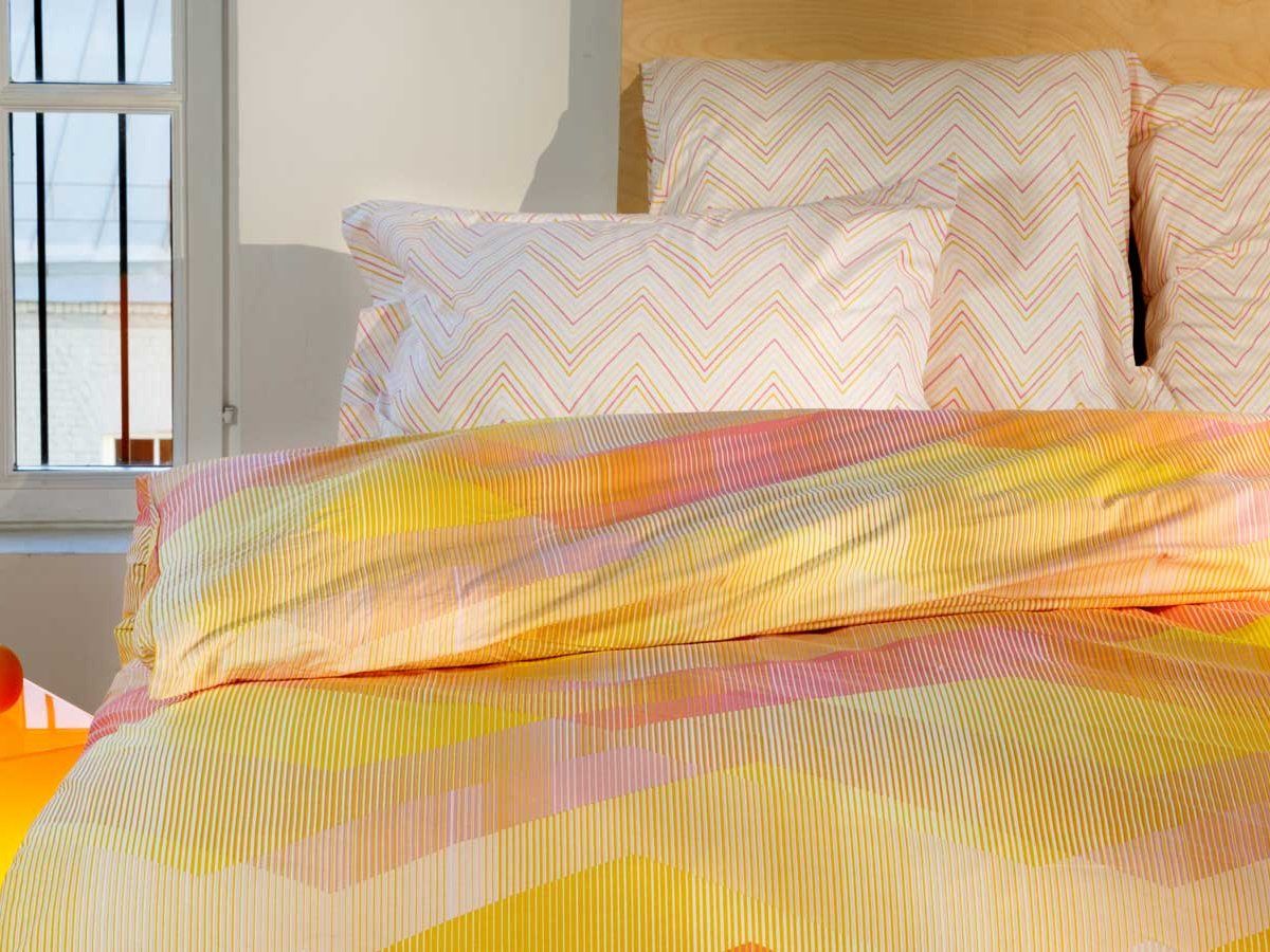 Комплект постельного белья «Румба» наполнит Вашу спальню энергией солнца. Нежные теплые цвета оживят интерьер и добавят ему красок. Контраст сдержанного дизайна наволочек и простыни с ярким пододеяльником придает комплекту выразительность. Четкие ломаные линии и иллюзия ромбов выглядят эффектно. Это популярные сегодня сочетания геометрических принтов.
