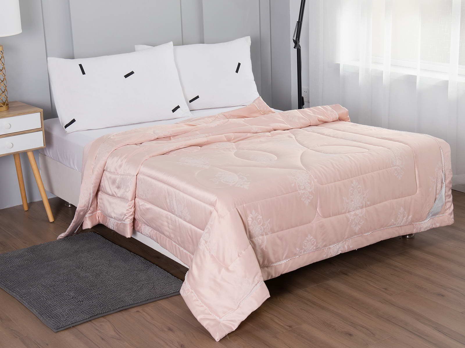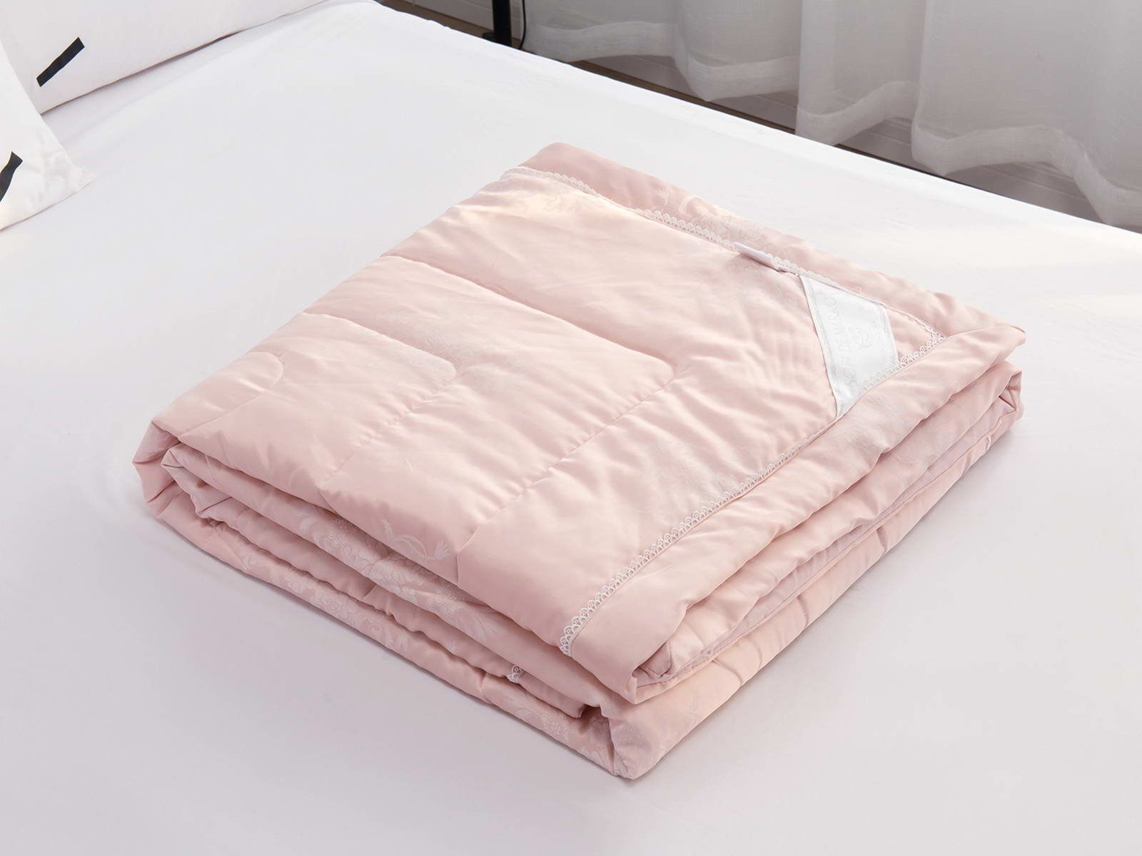 Одеяло представлено в модных цветах этого сезона: пудра, персик, крем, серый, карамель. Такие оттенки придадут нотки изысканности и утонченности вашей спальне. Изделие украшает декоративная стежка, создающая на одеяле прямые, изогнутые линии и окружности. С помощью специального станка на ткань нанесен уникальный повторяющийся рисунок в винтажном стиле. Вы можете выбрать узор на свой вкус: небольшой лавровый венок, венчающий корону, или одну из цветочных композиций среднего размера. По широкому канту в тон изделию проходит деликатная полоска светлого кружева.