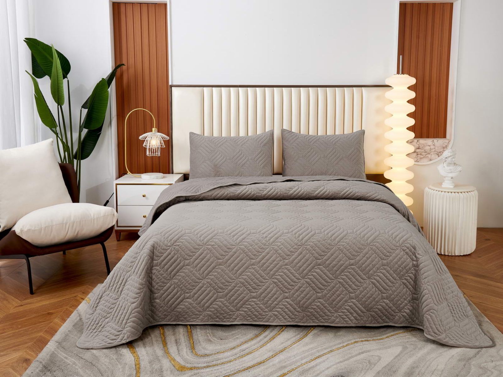 Покрывала выполнены в 10 оттенках: крем, мокко, пепельный, песочный, светло-бежевый, светло-серый, серый, темно-серый, чайная роза и черный. Стежка в виде геометрического орнамента подойдет к любому современному интерьеру. Из-за особого плетения, велюровая ткань покрывала отражает свет и красиво переливается при различном освещении.