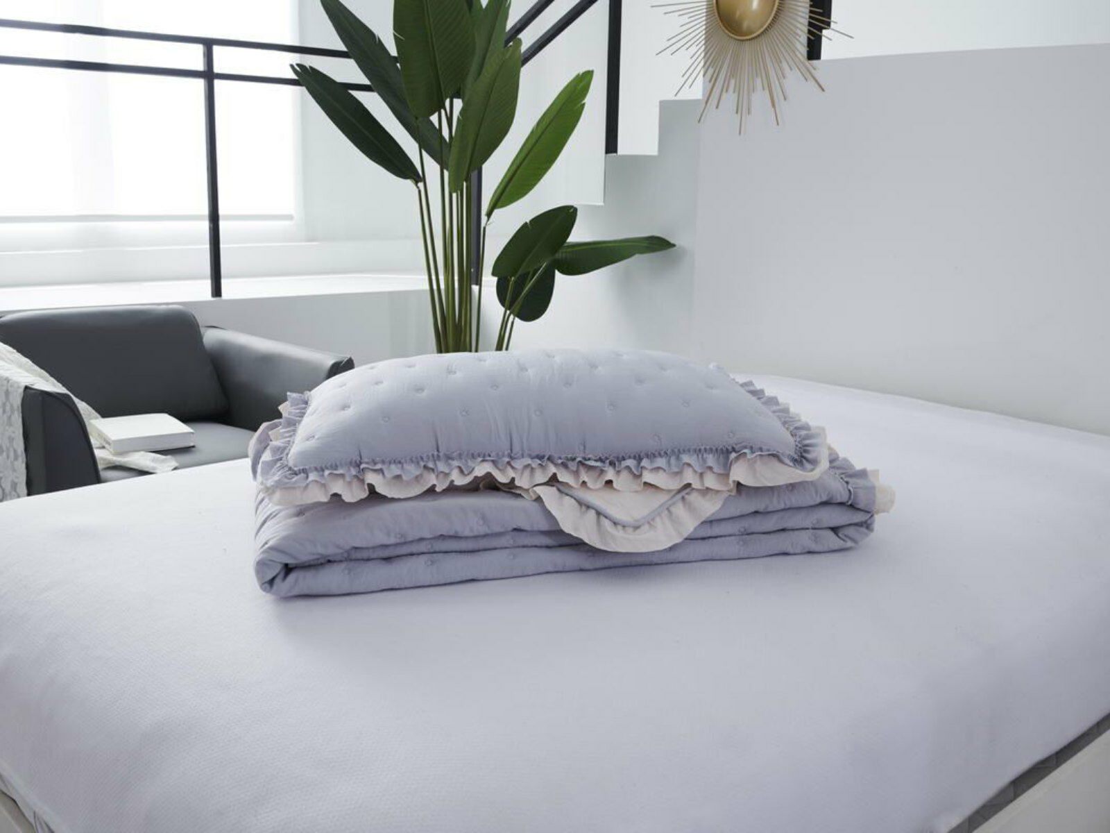 В комплект входят покрывало и одна либо две наволочки (50х70 см) из аналогичного материала в зависимости от размера.
