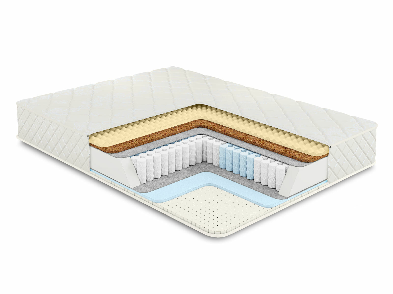 Пружинный матрас в основе которого многозональный независимый пружинный блок 1000 пружин на спальное место обеспечивает ортопедическую поддержку и комфорт во время сна. Независимые пружины подстраиваются под формы человека, потому что каждая пружина находится в отдельном кармашке и обеспечивает равномерное распределение веса