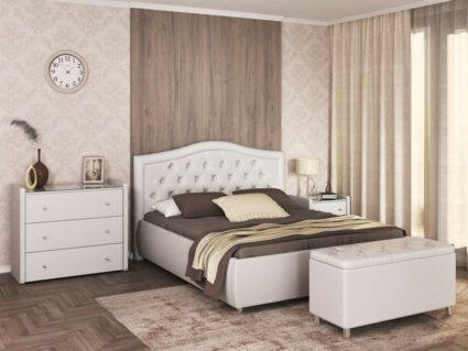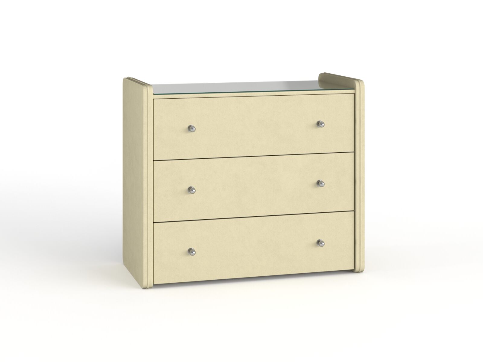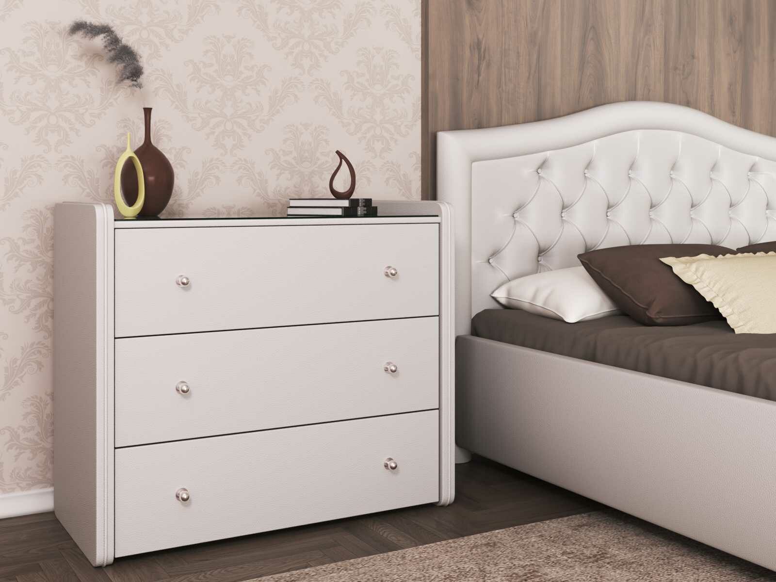 Стильный комод с тремя ящиками станет не только частью декора спальни, но и полезным функциональным дополнением интерьера вашей комнаты. Вместительные ящики для белья позволят практично разместить спальные принадлежности и аксессуары. На стеклянной столешнице расположится ночник, ваши любимые рамки с фотографиями, а широкая палитра расцветок обивки комода из экокожи, велюра или рогожки позволит ему органично вписаться в любой интерьер